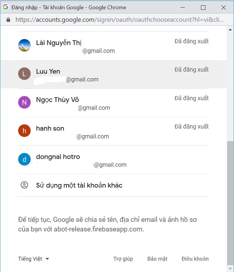 Bước 2: Bấm nút đăng nhập bằng gmail để đăng nhập. Gmail sẽ xuất hiện danh sách các email thường dùng của máy tính đó như hình sau: