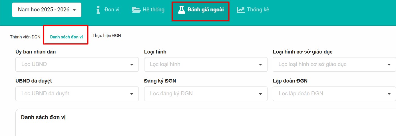 Bước 1: Từ giao diện chính, Thầy/Cô vào menu Đánh giá ngoài → chọn tab Danh sách đơn vị