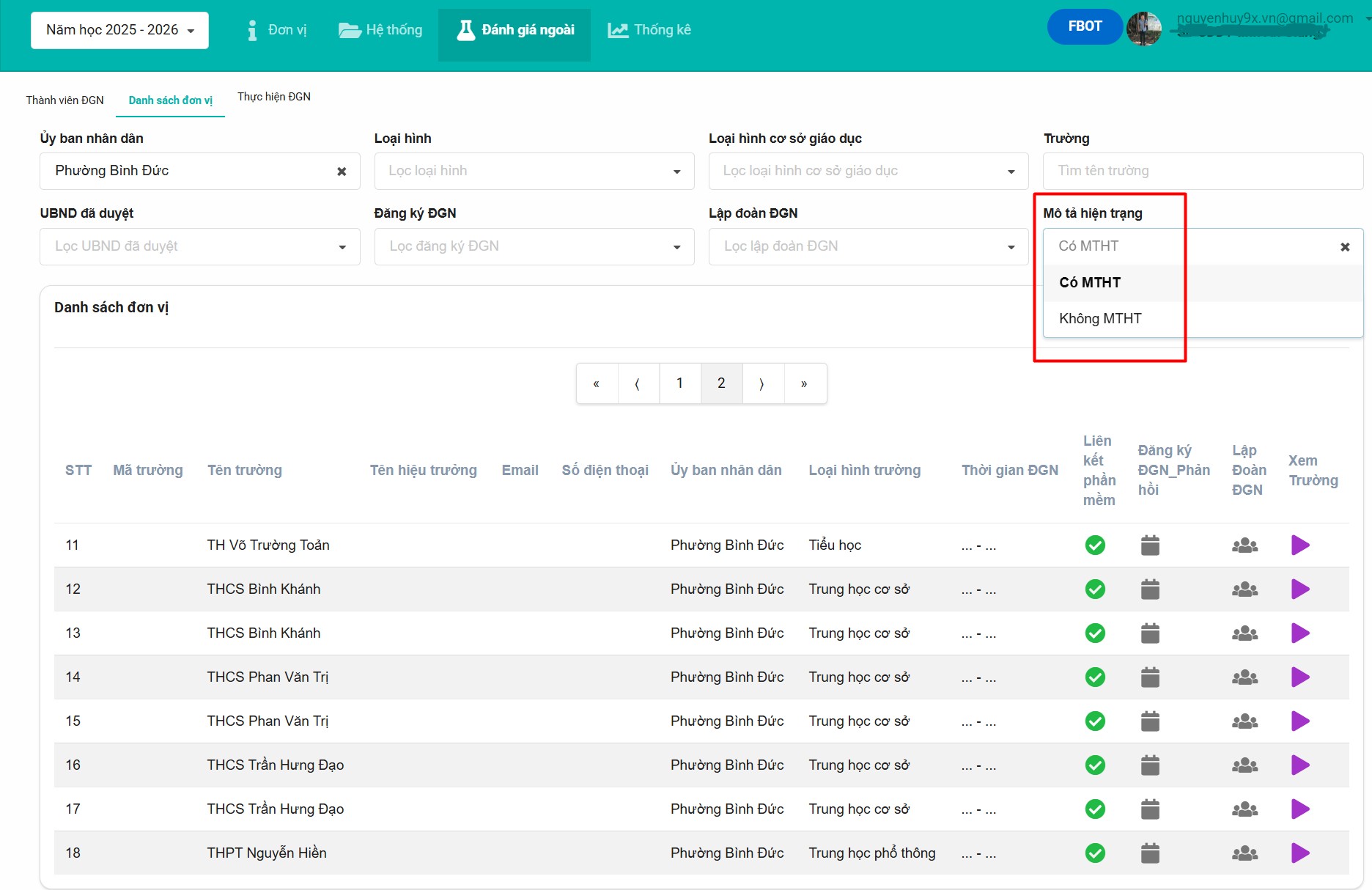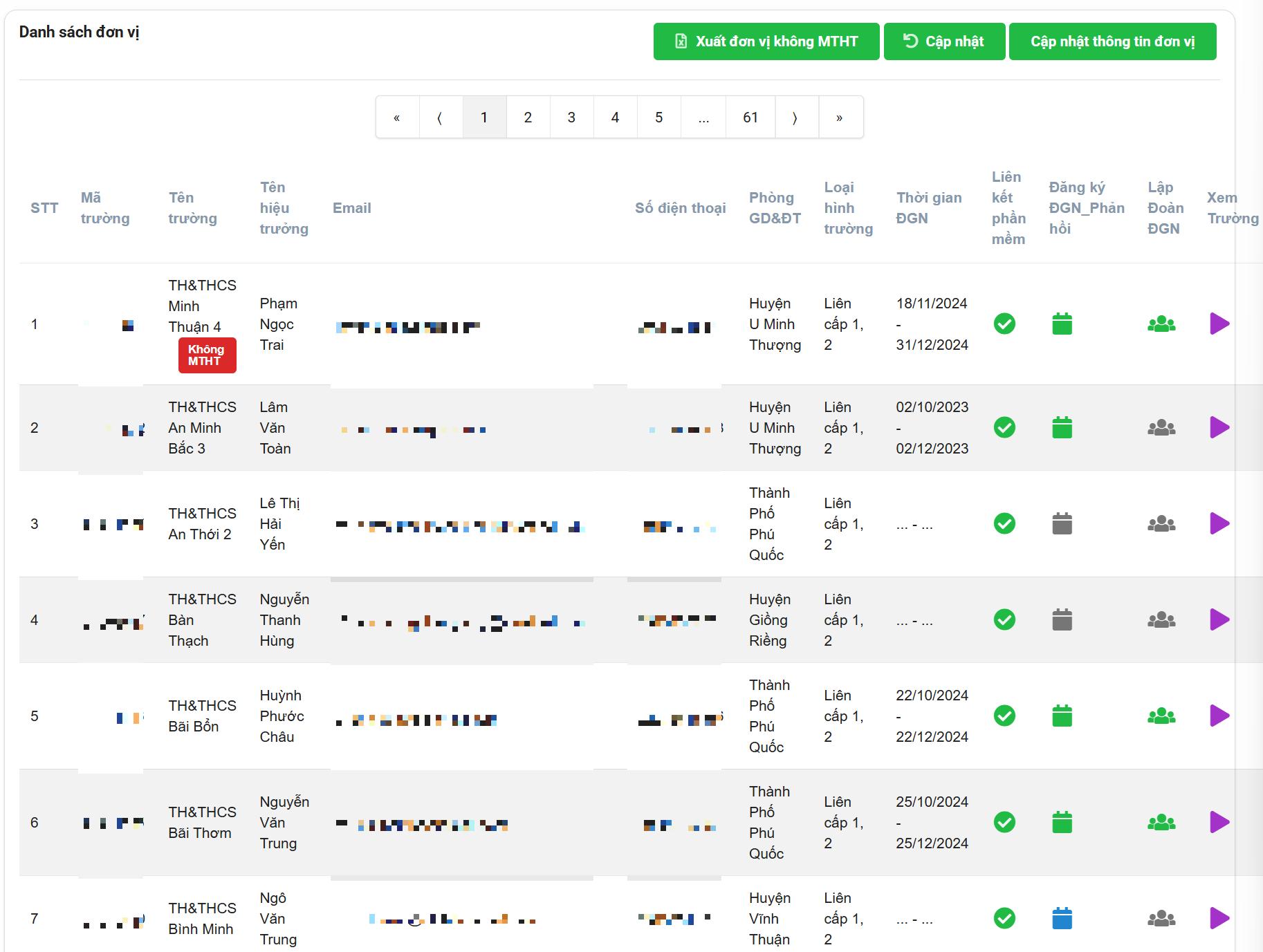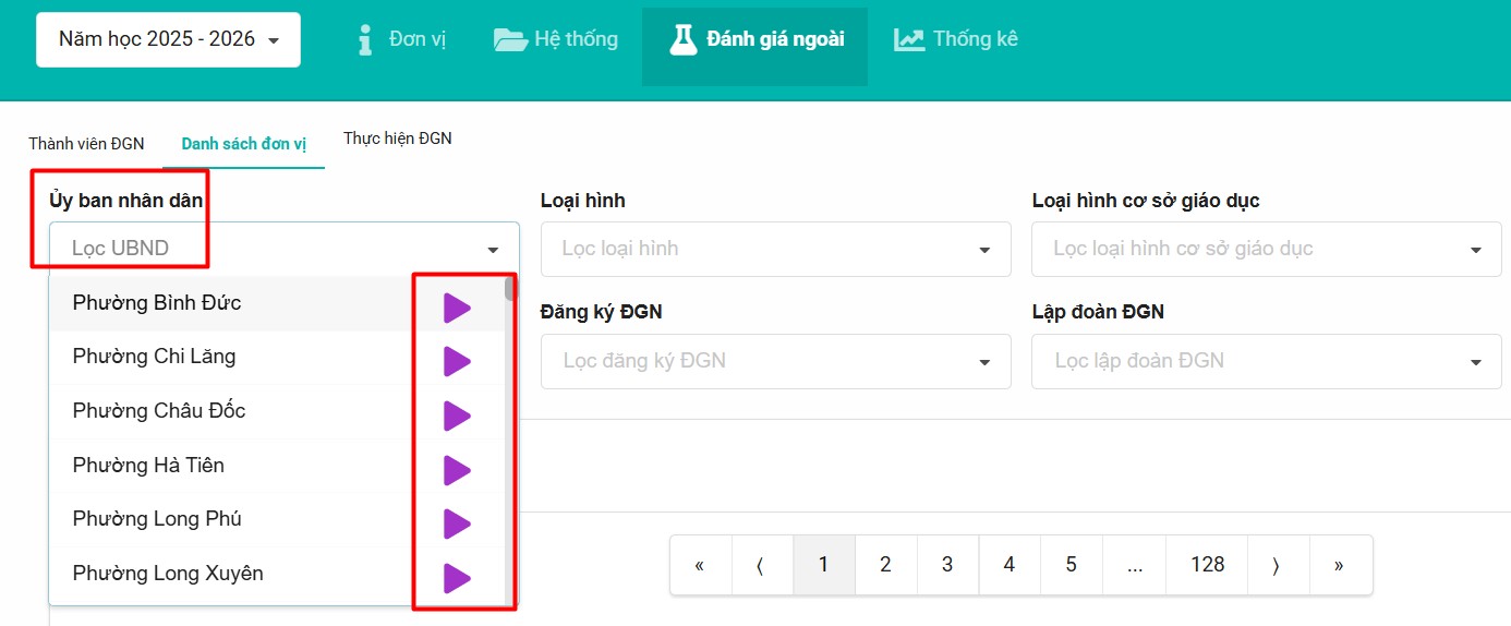 Bước 2: Phần mềm sẽ hiển thị danh sách tất cả các trường thuộc đơn vị. Tại đây, Thầy/Cô có thể sử dụng các công cụ lọc để tìm kiếm nhanh và chính xác: