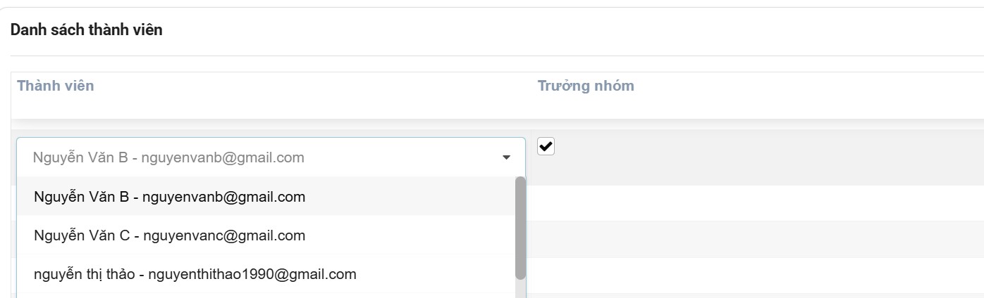 Bước 7: Để phân công Trưởng nhóm, tích chọn vào ô Trưởng nhóm tại tên thành viên tương ứng