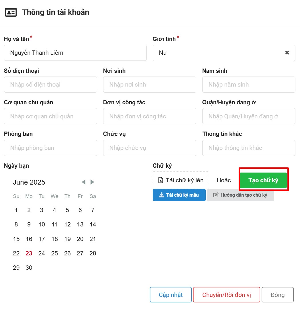 - Chữ ký sau khi cập nhật sẽ được sử dụng để ký số trong các báo cáo, phiếu đánh giá, minh chứng,… theo đúng quyền hạn đã được phân quyền