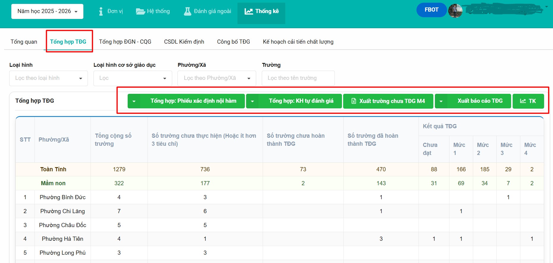 Cung cấp thống kê chi tiết theo dạng bảng biểu, gồm số lượng trường/quận huyện đã và chưa thực hiện tự đánh giá, đồng thời cho biết kết quả đánh giá theo các mức đạt.