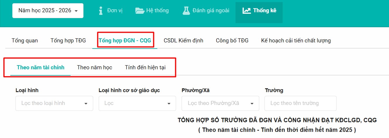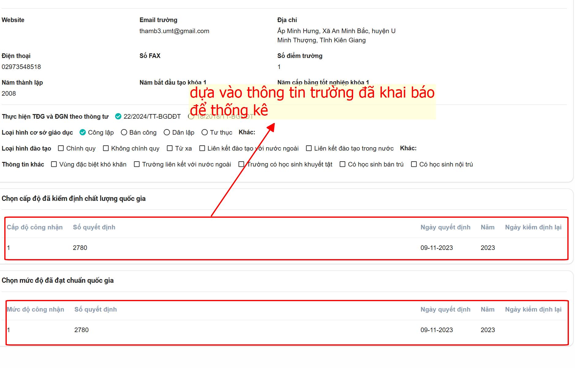 Dựa vào thông tin khai báo trong mục “Đơn vị” của từng trường, phần mềm sẽ tổng hợp về: