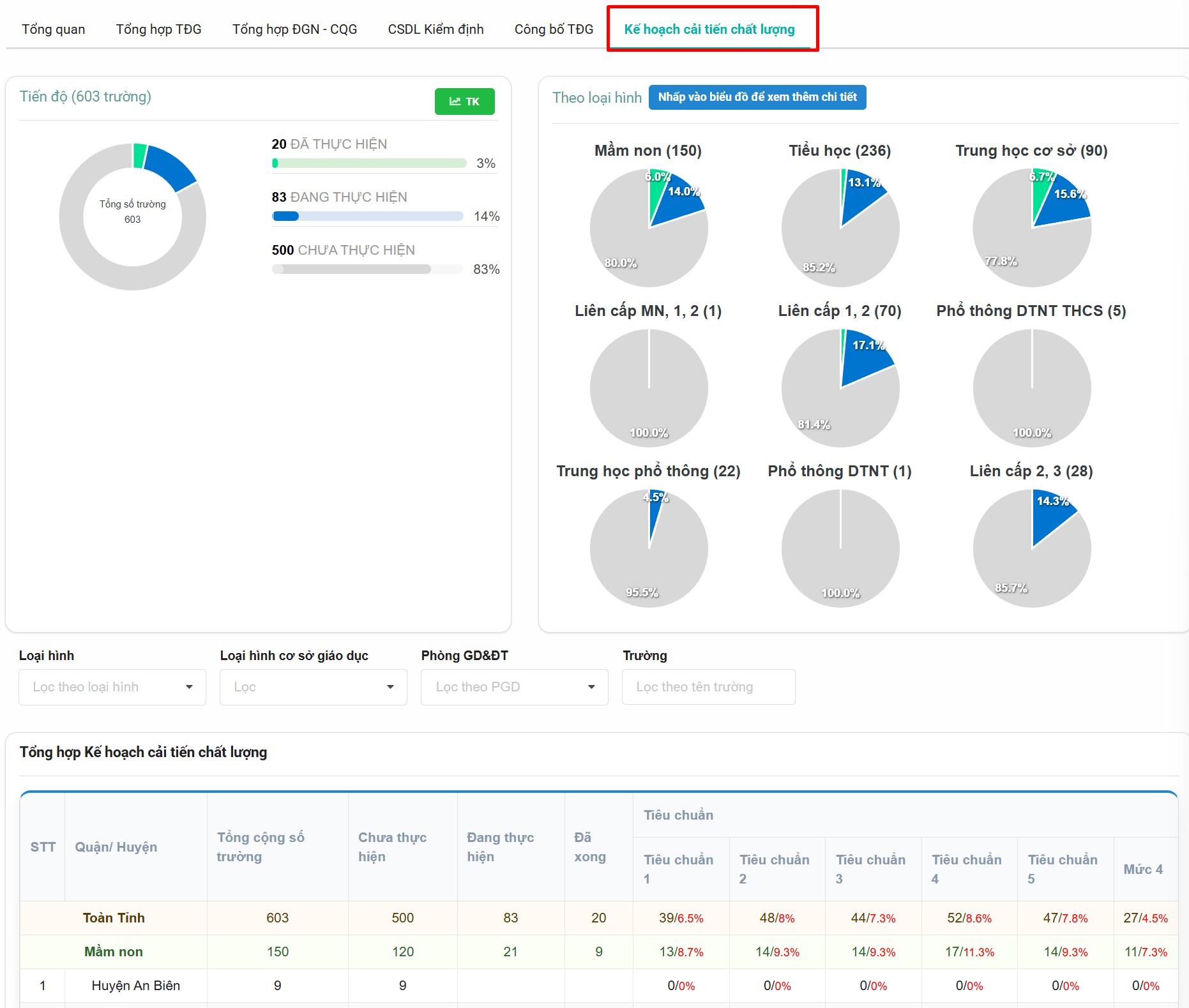 Phần thống kê này sẽ giúp Thầy/Cô ở cấp Phòng/Sở dễ dàng theo dõi quá trình cải tiến của từng trường, từ đó có những chỉ đạo, hỗ trợ phù hợp.