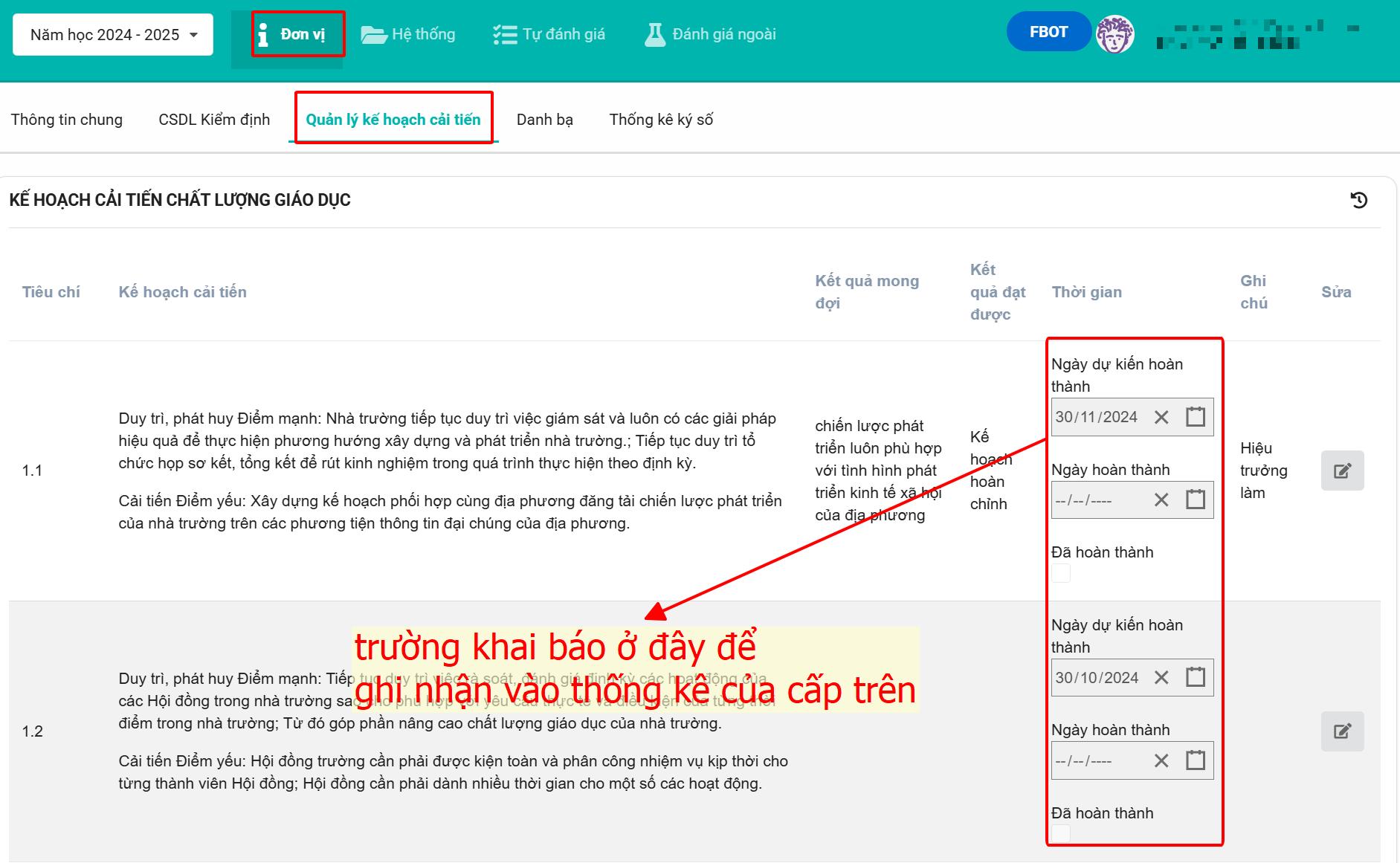 - Trường cần nhập thông tin rõ ràng về ngày dự kiến hoàn thành, ngày hoàn thành, và tích vào ô