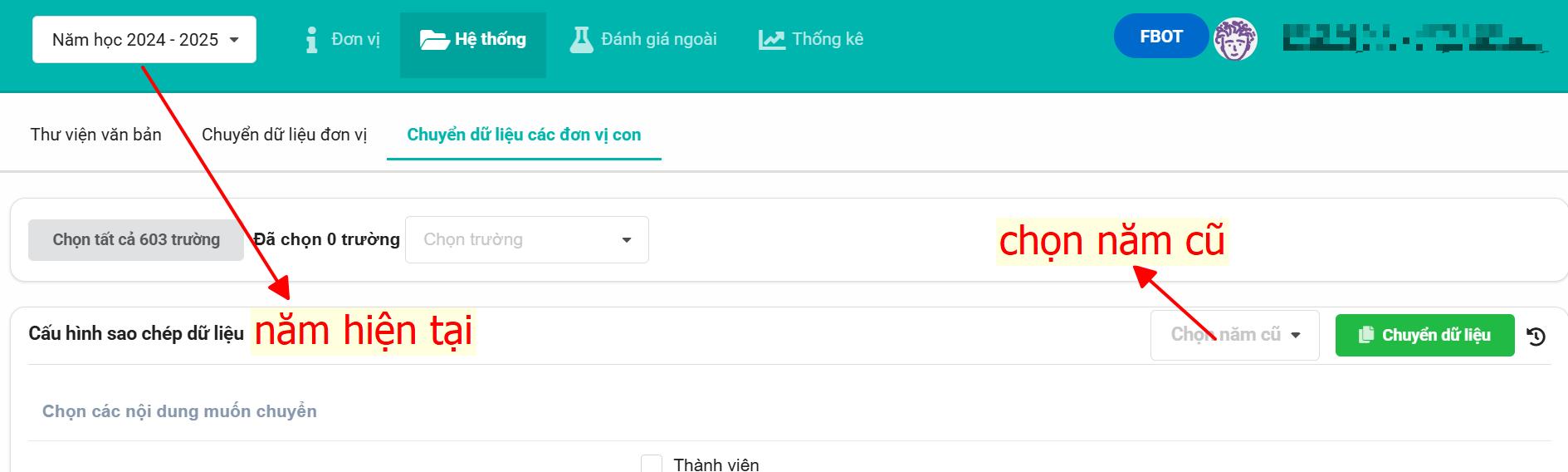 Lưu ý quan trọng: Các trường cũng có chức năng tự chuyển dữ liệu. Trong trường hợp trường đã thao tác và cập nhật dữ liệu mới ở năm hiện tại, nếu Sở tiếp tục chuyển lại thì dữ liệu vừa cập nhật của trường sẽ bị ghi đè và mất. Vì vậy, cần thống nhất giữa Sở và các đơn vị trường trước khi thực hiện thao tác chuyển dữ liệu để tránh mất dữ liệu không mong muốn.