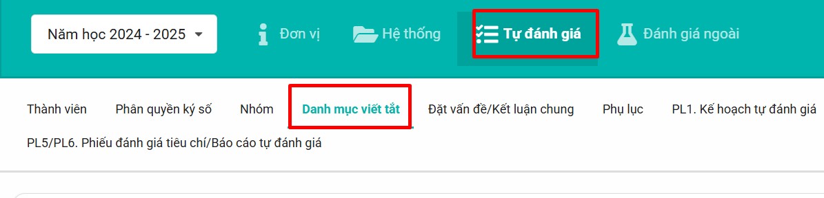 Bước 1: Vào menu Tự đánh giá → chọn Danh mục viết tắt
