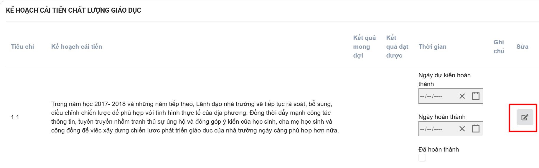 - Kết quả đạt được: Mức độ đã đạt được của trường đến thời điểm hiện tại.