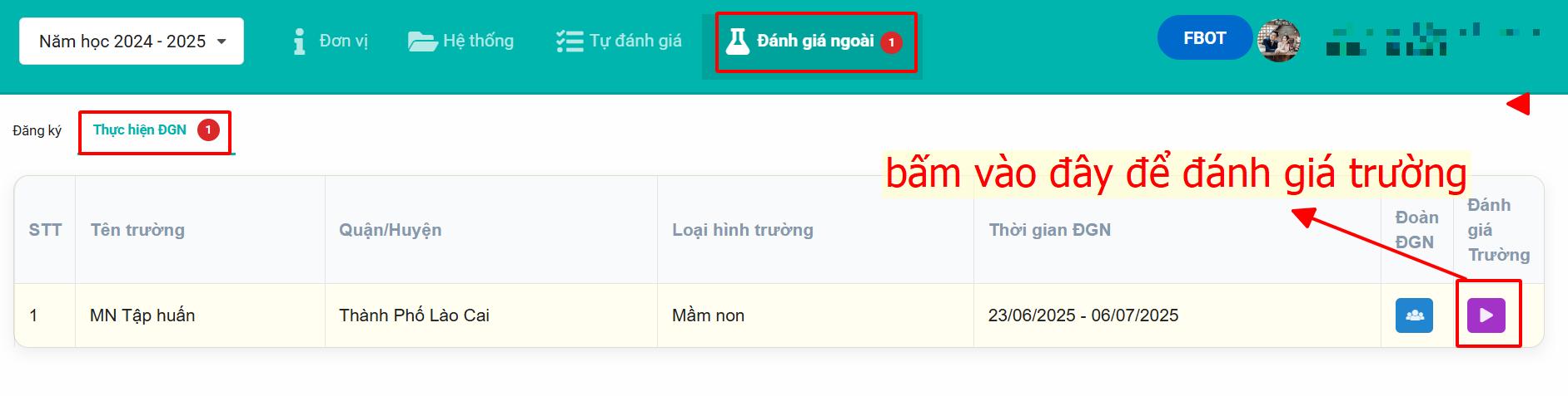 Bước 1: Vào menu Đánh giá ngoài → chọn tab Thực hiện ĐGN → bấm vào biểu tượng mũi tên ở cột Đánh giá trường để truy cập vào giao diện đánh giá của trường được phân công.