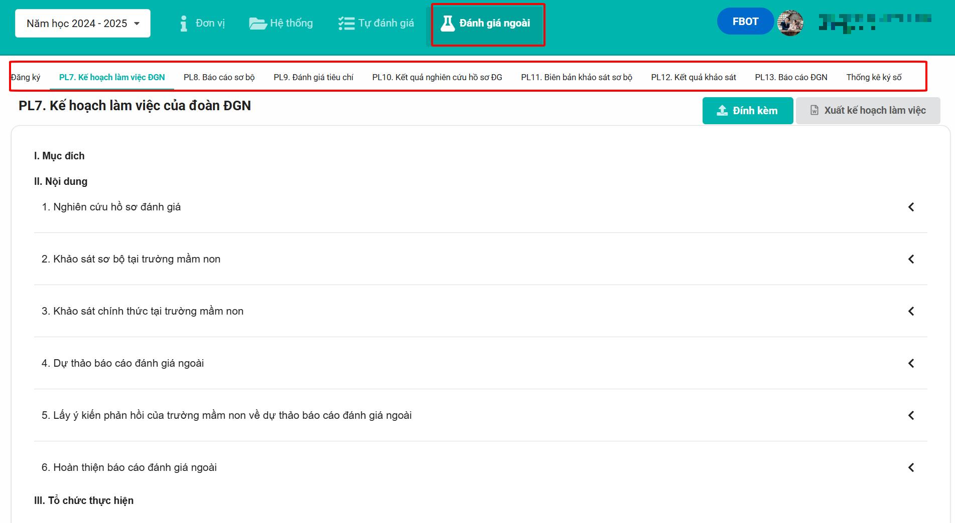 Bước 3: Để thực hiện đánh giá, Thầy/Cô vào lại menu Đánh giá ngoài → chọn phụ lục cần đánh giá (ví dụ: PL7. Kế hoạch làm viêc, PL9. Đánh giá tiêu chí)