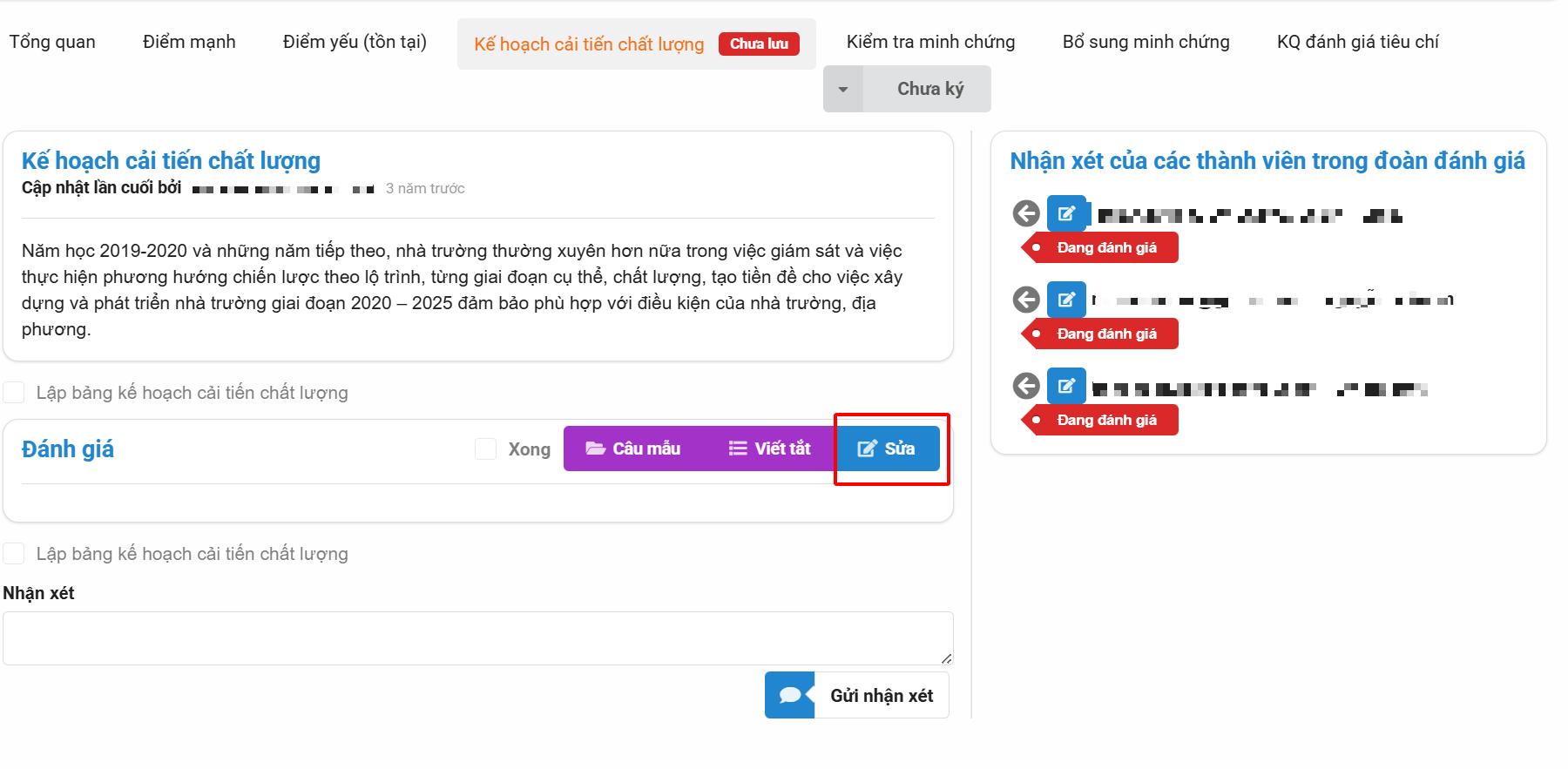 Bước 4: Tại từng phụ lục, Thầy/Cô bấm nút Sửa để nhập nội dung nhận xét hoặc đánh giá.