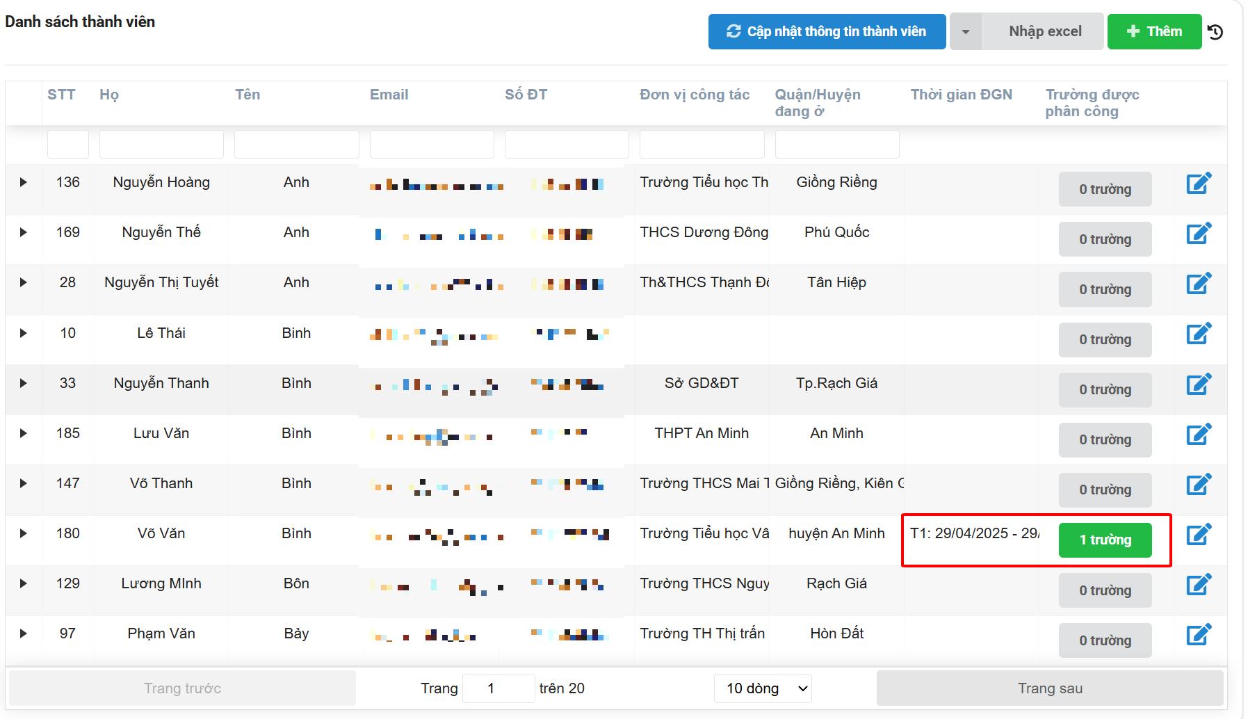 - Cột “Trường được phân công”: hiển thị số lượng trường mà thành viên đang được giao nhiệm vụ đánh giá. Khi bấm vào số trường, Thầy/Cô sẽ xem được chi tiết danh sách trường, kèm theo thời gian đánh giá của từng trường.