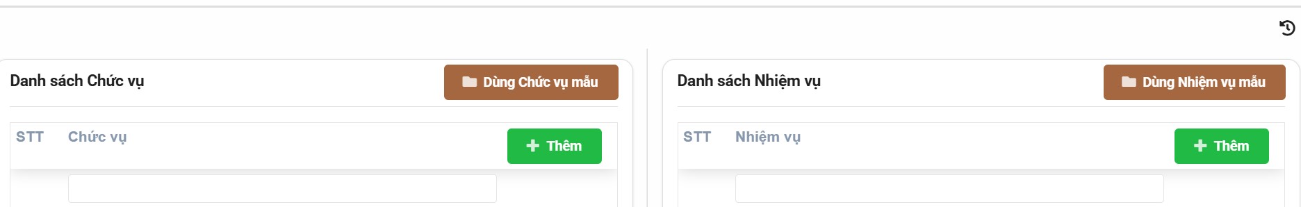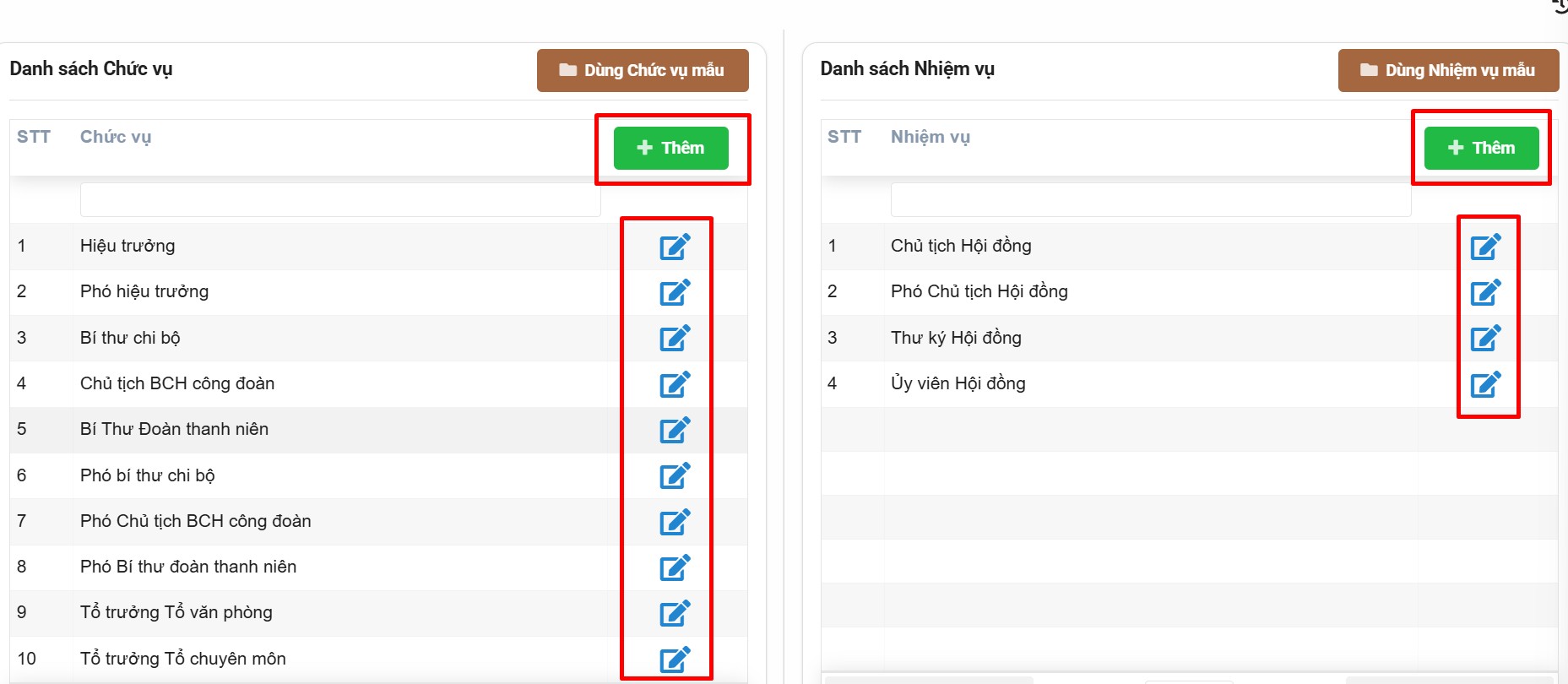 Bước 2: Với những trường mới (chưa có dữ liệu), Thầy/Cô có thể bấm nút Dùng chức vụ mẫu và nút Dùng nhiệm vụ mẫu lúc này phần mềm sẽ tự động thêm sẵn các chức vụ và nhiệm vụ theo đúng quy định vào danh sách.