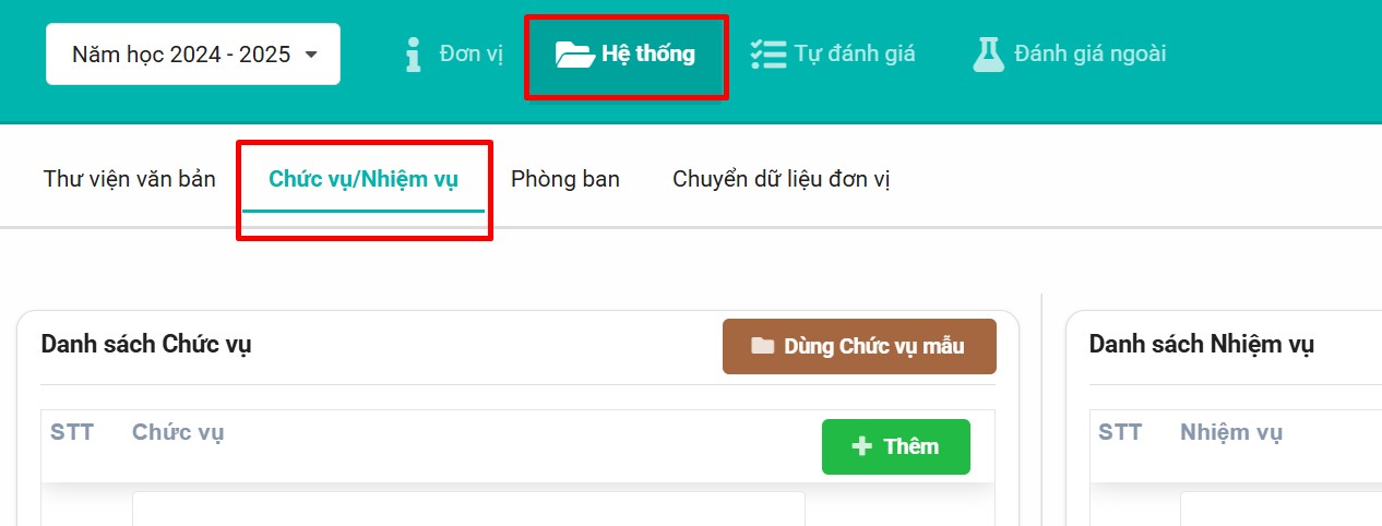 Bước 1: Vào menu Hệ thống → chọn Chức vụ/Nhiệm vụ
